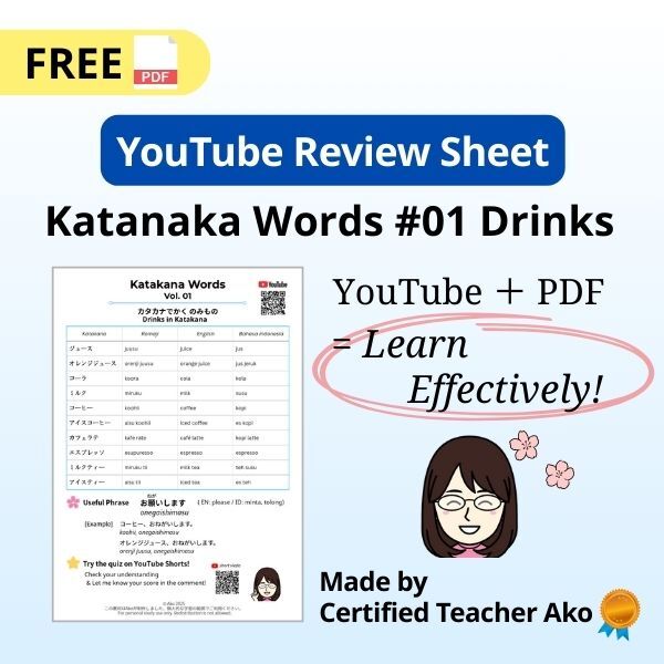 Free Review Sheet for YouTube video "Katakana #01 - Drinks". Includes English & Indonesian translations.